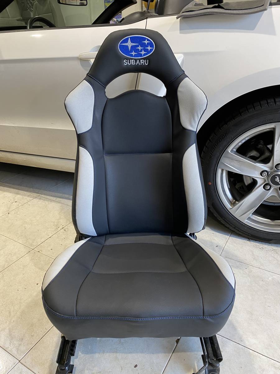 Le client est venu avec sa Subaru à notre atelier sur Lunel afin de modifier et restaurer les sièges sa voiture et en changeant le vieux Skaï et Tissu par du Vegan noir et gris et une broderie.